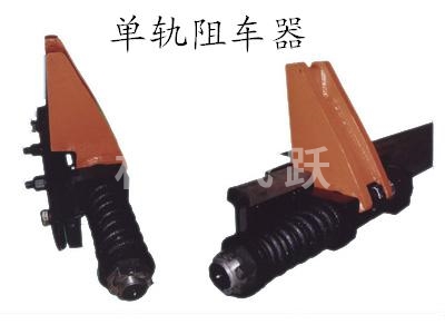 單軌阻車器實用新型涉及煤礦井下運輸機械技術領域,單軌阻車器由兩根平行的固定支座和阻車桿、前支承座、后支承座及腳踏連動裝置組成,單軌阻車器固定支座的兩端分別固定在前支承座和后支承座上,阻車桿置在兩個固定支座之間,連接在兩個固定支座之間的轉軸穿過阻車桿的中部,阻車桿呈上端小下端粗重狀,自然狀態下,其上端翹起,腳踏連動裝置由腳踏板、拉線和撥桿組成,撥桿的中部鉸接于兩個固定支承座之間,其上端通過拉線與腳踏板連接。
